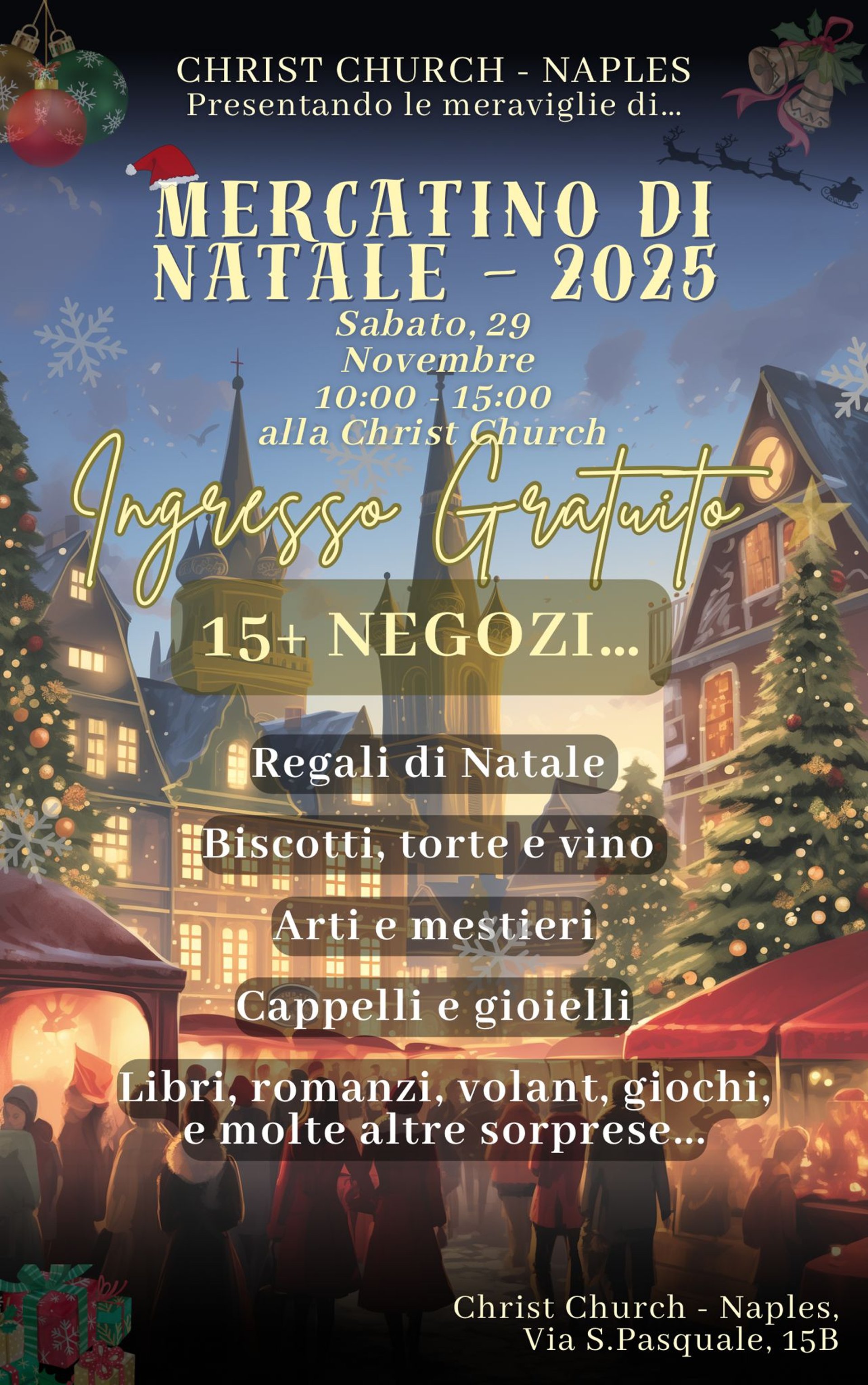 L’Associazione Siddharta sarà presente al Mercatino di Natale che si terrà nella suggestiva Chiesa Anglicana di Napoli, un luogo ricco di atmosfera e spiritualità, perfetto per accogliere un evento dedicato alla condivisione e alla bellezza del periodo natalizio.